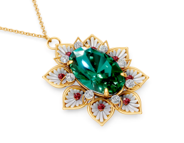 A delicate pendant balancing bold color with intricate, airy detail. At its heart is a luminous oval-cut emerald. It is encircled by eight stylized petals, rendered in fluted white enamel and rimmed in yellow gold. The floral lattice is punctuated by alternating brilliant diamonds and vivid small rubies.