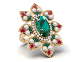A stunning floral jewel that captures the vibrancy of a palace garden. The ring centers on a luminous oval-cut emerald, encircled by a delicate halo of pearls. Radiating outward, eight sculpted gold petals bloom; each cradles a lustrous pearl and emerald accents, before culminating in a vivid pear-cut ruby tip.