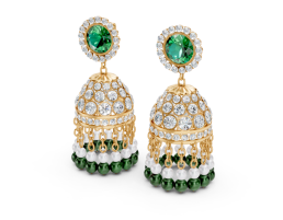 Traditional bell-shaped earrings. Each earring’s dome is encrusted with polki diamonds, encircling a central emerald orb carved with faint floral patterns. Tiny pearl and emerald tassels sway beneath, creating a hypnotic rhythm when worn. They are lush and weighty, jewels that once overheard empire-altering whispers.